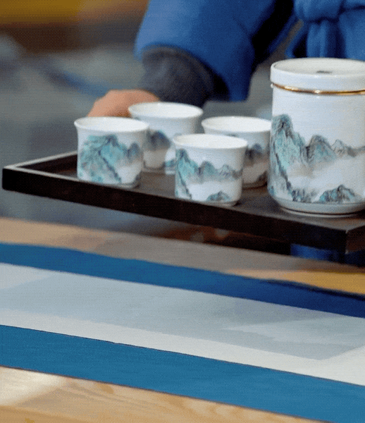 再比如这套为“一带一路”国际合作高峰论坛领导人午宴制作的“丝路国宴”餐瓷,水韵蓝的主色调,把中国山水画描在了餐瓷上,格外有韵味。